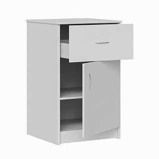 Тумба включает в себя ящик под столешницей и отделение со съемной полкой, закрывающееся дверкой. Выдвижение ящика при помощи роликовых направляющих, стенки ящика лдсп, дно ящика двп. Фасад открываеся при помощи четырехшарнирной накладной петли.