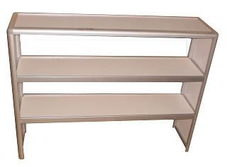 Изделие включает в себя три полки. Каркас изделия выполнен из анодированного алюминиевого профиля различного сечения. Сборка каркаса выполнена при помощи специальных замков и угловых соединителей закрепленных саморезами. Заполнение каркаса – двухсторонний пластик толщиной 3 мм или ЛДСП 8 мм. Пластик вставляется в каркас при помощи уплотнителя, что исключает возникновение зазоров и щелей в конструкции. Торцы ножек изделия закрыты пластмассовыми заглушками.