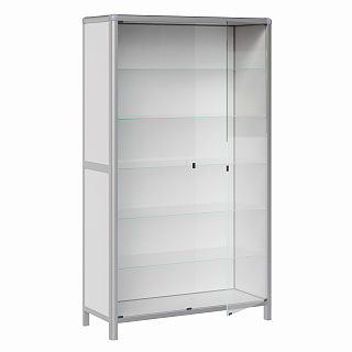 Фасад фиксируется при помощи магнитного держателя. Для удобства пользования на фасад устанавливается металлическая ручка. Внутри шкафа находятся полки из стекла 4 мм. Высота полок может регулироваться при помощи полкодержателей.