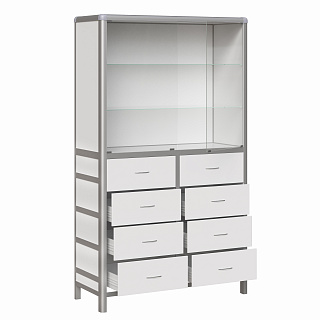Изделие включает в себя сверху отделение, закрытое двумя дверками из стекла 4 мм в алюминиевой рамке, внизу отделение, включающее восемь выдвижных ящиков.Внутри отделения с дверками расположены две регулируемые по высоте полка из стекла .