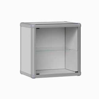 Фасад фиксируется при помощи магнитного держателя. Для удобства пользования на фасад устанавливается металлическая ручка. Внутри шкафа находится полка из стекла 3 мм. Высота полки может регулироваться при помощи полкодержателей.
