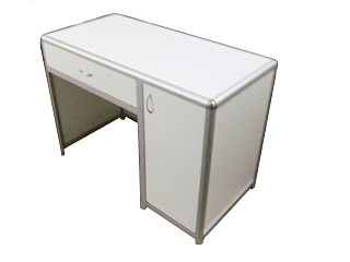 Каркас изделия выполнен из анодированного алюминиевого профиля различного сечения. Сборка каркаса выполнена при помощи специальных замков и угловых соединителей закрепленных саморезами. Заполнение каркаса – двухсторонний пластик толщиной 3 мм или ЛДСП 8 мм. Пластик вставляется в каркас при помощи уплотнителя, что исключает возникновение зазоров и щелей в конструкции. Столешница МДФ 16 мм с пластиковым покрытием 0,6 мм. Столешница фрезеруется и вставляется в паз верхнего профиля.