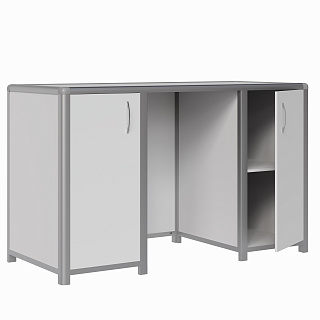 Фасад у тумб выполнен из пластика 3 мм в рамочном алюминиевом профиле или ЛДСП 16 мм , окантованный кромкой ПВХ 0,4*19 мм. Фасады навешиваются на Петли, фиксируются при помощи магнитного держателя. Для удобства пользования на фасады устанавливается металлическая ручка. Внутри тумбы находится полка из ЛДСП 16 мм, видимые торцы облицованы кромкой ПВХ 0,4*19 мм. Высота полки может регулироваться при помощи полкодержателей. Торцы вертикальных стоек закрыты усиленными резьбовыми заглушками, в которые вворачиваются регулируемые опоры.