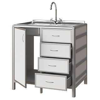 Изделие состоит из вертикальных стенок, задней стенки (царга), слева одна дверь, справа четыре ящика и сверху накладной мойкой с крылом и со смесителем. Каркас изделия выполнен из анодированного алюминиевого профиля различного сечения по. Сборка каркаса выполнена при помощи специальных замков и угловых соединителей закрепленных саморезами. Заполнение каркаса – двухсторонний пластик толщиной 3 мм . Пластик вставляется в каркас при помощи уплотнителя, что исключает возникновение зазоров и щелей в конструкции. Фасад (дверки) у стола выполнен из пластика 3 мм в рамочном алюминиевом профиле. Фиксируется при помощи магнитного держателя. Для удобства пользования на фасад устанавливается металлическая ручка. Внутри тумбы находится полка из ЛДСП 16 мм, видимые торцы облицованы кромкой ПВХ 0,4*19 мм. Высота полки может регулироваться при помощи полкодержателей. Фасад ящиков выполнен из пластика 3 мм в рамочном алюминиевом профиле. Выдвижение ящиков на роликовых направляющих, неполного выдвижения и защитой от выкатывания. Боковые стенки ящиков металлические с полимерным покрытием. Дно и задняя стенка ящиков из ЛДСП 16 мм крепятся к боковым стенкам (металлобоксу 450*86) при помощи саморезов. Видимые торцы ящиков облицованы кромкой ПВХ 0,4*19 мм. Для удобства пользования на ящики устанавливается металлические ручки. Максимальная нагрузка на ящик до 20 кг. Сверху устанавливается накладная прямоугольная одночашевая мойка с крылом размером 600*800*160(180) мм (размер чаши 400*400), выполненная из нержавеющей стали. Для обеспечения водостойкости стыки между профилем и торцами мойки обрабатываются санитарным силиконовым герметиком. Мойка комплектуется сифоном и двухвентильным смесителем. Дно выполнено из ЛДСП 16 мм. Торцы вертикальных стоек закрыты усиленными резьбовыми заглушками, в которые вворачиваются регулируемые опоры.