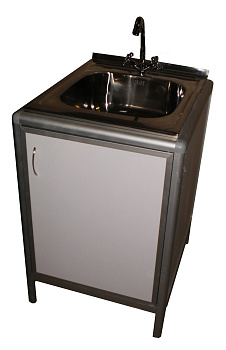Изделие состоит из вертикальных стенок, задней стенки (царга), двери, накладной мойкой со смесителем. Каркас изделия выполнен из анодированного алюминиевого профиля различного сечения. Сборка каркаса выполнена при помощи специальных замков и угловых соединителей закрепленных саморезами. Заполнение каркаса – двухсторонний пластик толщиной 3 мм. Пластик вставляется в каркас при помощи уплотнителя, что исключает возникновение зазоров и щелей в конструкции. Фасад выполнен из пластика 3 мм в рамочном алюминиевом профиле. Фиксируется при помощи магнитного держателя. Для удобства пользования на фасад устанавливается металлическая ручка. Сверху устанавливается накладная прямоугольная мойка размером 500х600 мм (размер чаши 350*400), выполненная из нержавеющей стали. Для обеспечения водостойкости стыки между профилем и торцами мойки обрабатываются санитарным силиконовым герметиком. Мойка комплектуется сифоном и двухвентильным смесителем. Дно выполнено из ЛДСП 16 мм. Торцы вертикальных стоек закрыты усиленными резьбовыми заглушками, в которые вворачиваются регулируемые опоры.